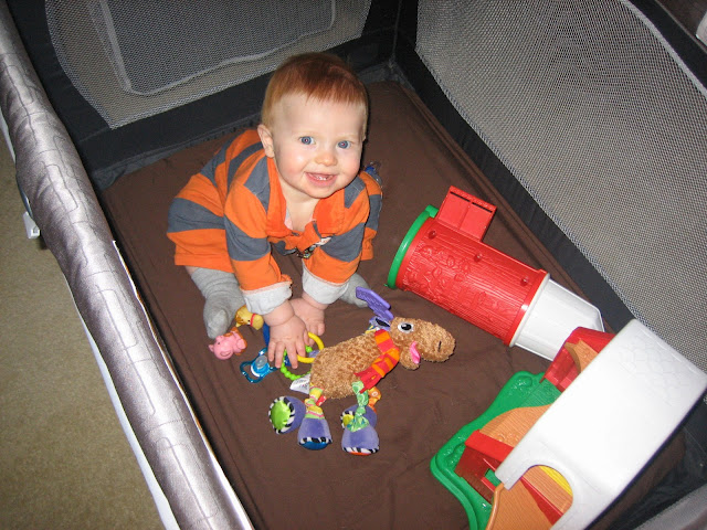 At first, he did really well. Lots of toys to play with, and ooh, pretty new sheets!