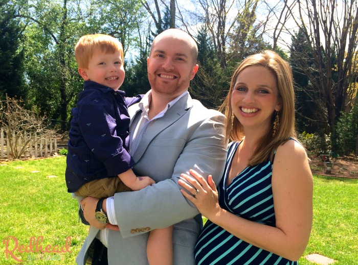When Sunday came, we were cooking up a storm to bring food to my in-law’s house and digging the iron out of a moving box in order to make sure we were presentable! (Yes, Mom, I found the iron! And used it!) My dress is from my Maternity Stitch Fix haul, all of which I was really happy with. Post to come. All that being said, I think we turned out rather nice. This is officially our last Easter photo as a family of three!