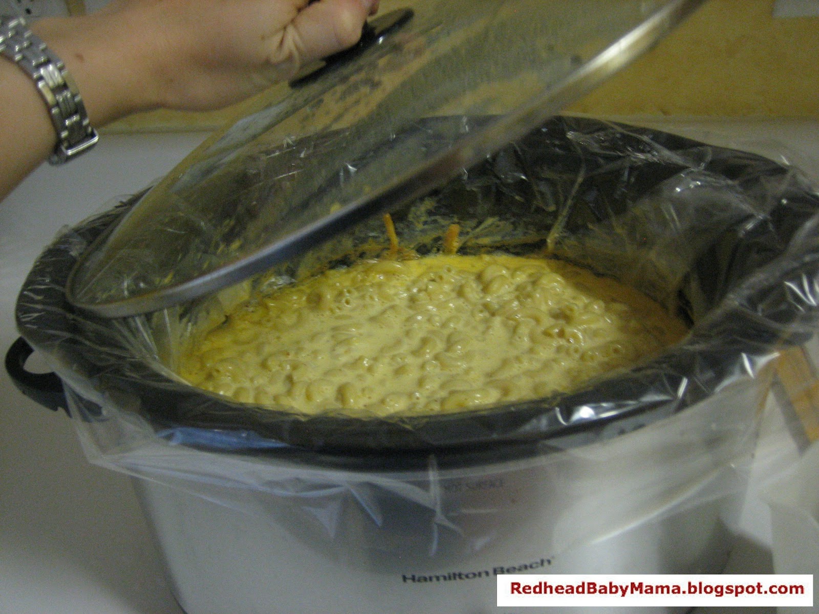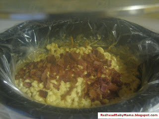 6. Cover crock pot, cook on the low setting for 2 hours. It is important to stir the mac once or twice about half way through to make sure it’s well blended.