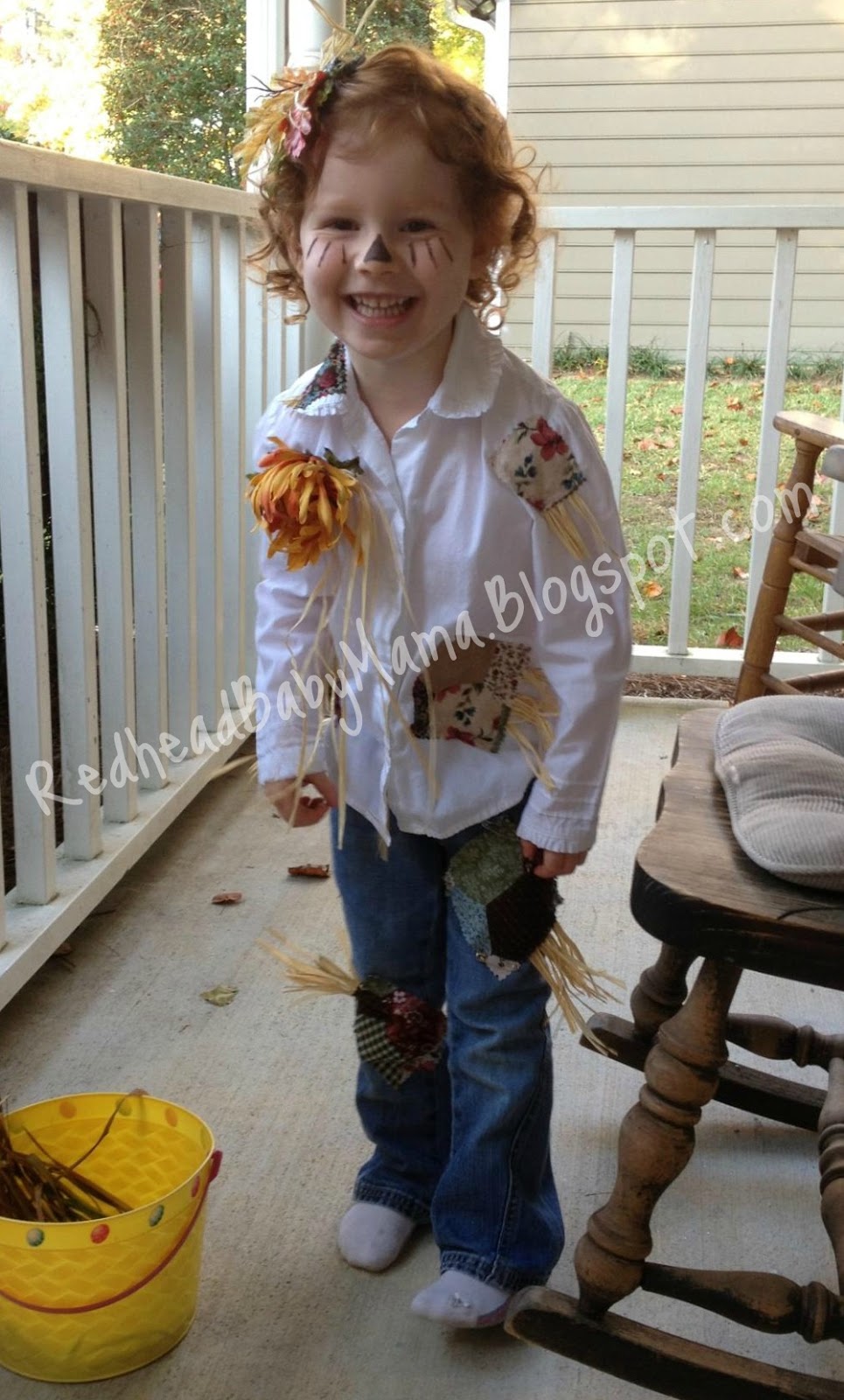 After application of the patches to the shirt, I trimmed up the pieces of raffia to a good length, and it looked great. To preserve the integrity of your shirt and pants, instead of sewing the patches down, simply safety pin them to the clothing. And if this isn’t the CUTEST scarecrow I’ve ever seen!! Krystyn told me N was ecstatic to wear her costume, and I couldn’t be happier. When she sent me this photo, that giant smile warmed my heart!