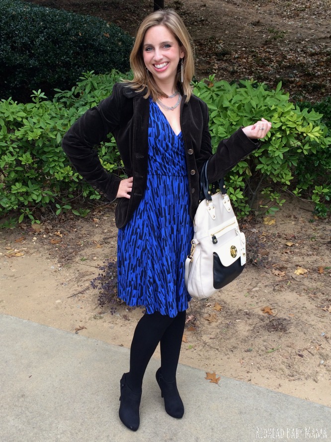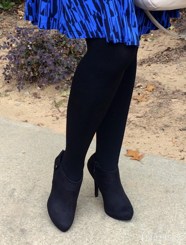 Personally, an awesome purse, a killer top or the perfect pair of shoes will do the trick. I feel dressed up (instead of my work-at-home uniform of PJ pants and fuzzy slippers), put together and can concentrate on my tasks at hand. I found some more-than-awesome booties at Rack Room this season, and they are letting me stretch my shorter dresses into chilly weather. I paired black suede heeled Angel booties with my cobalt blue dress and black velvet blazer for a CBS gig, and it was so comfortable. My tights are lined in fleece, so I was toasty from head to toe!