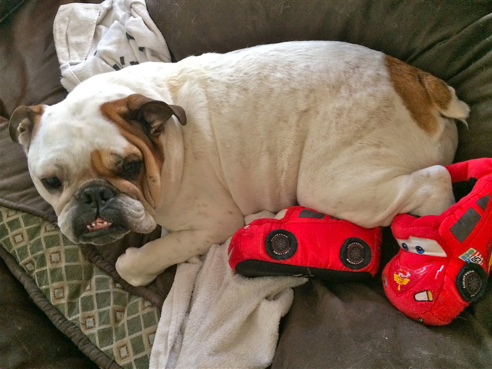 So to help you into the weekend (and to keep me giggling) here’s a picture of Dooley with Red’s McQueen slippers on, being an awesome sport,