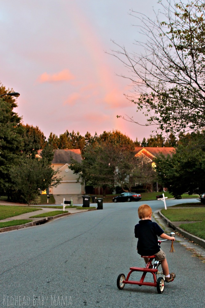 I know what you’re thinking. After we were all done, I figured it out, too. But in the meantime, all I could see was a slightly messy, but cutely dressed boy, a picture perfect bike, a shady summer day with a freaking rainbow in the sky. I was pulling my hair out that Hubs was in the shot (in his sweats… I apparently forgot to tell him that my brain decided it was an impromptu photo shoot), that Red wasn’t constantly smiling at the camera, that the bike was leading him into the ditch, that it wasn’t like one of those freaking Hallmark commercials.