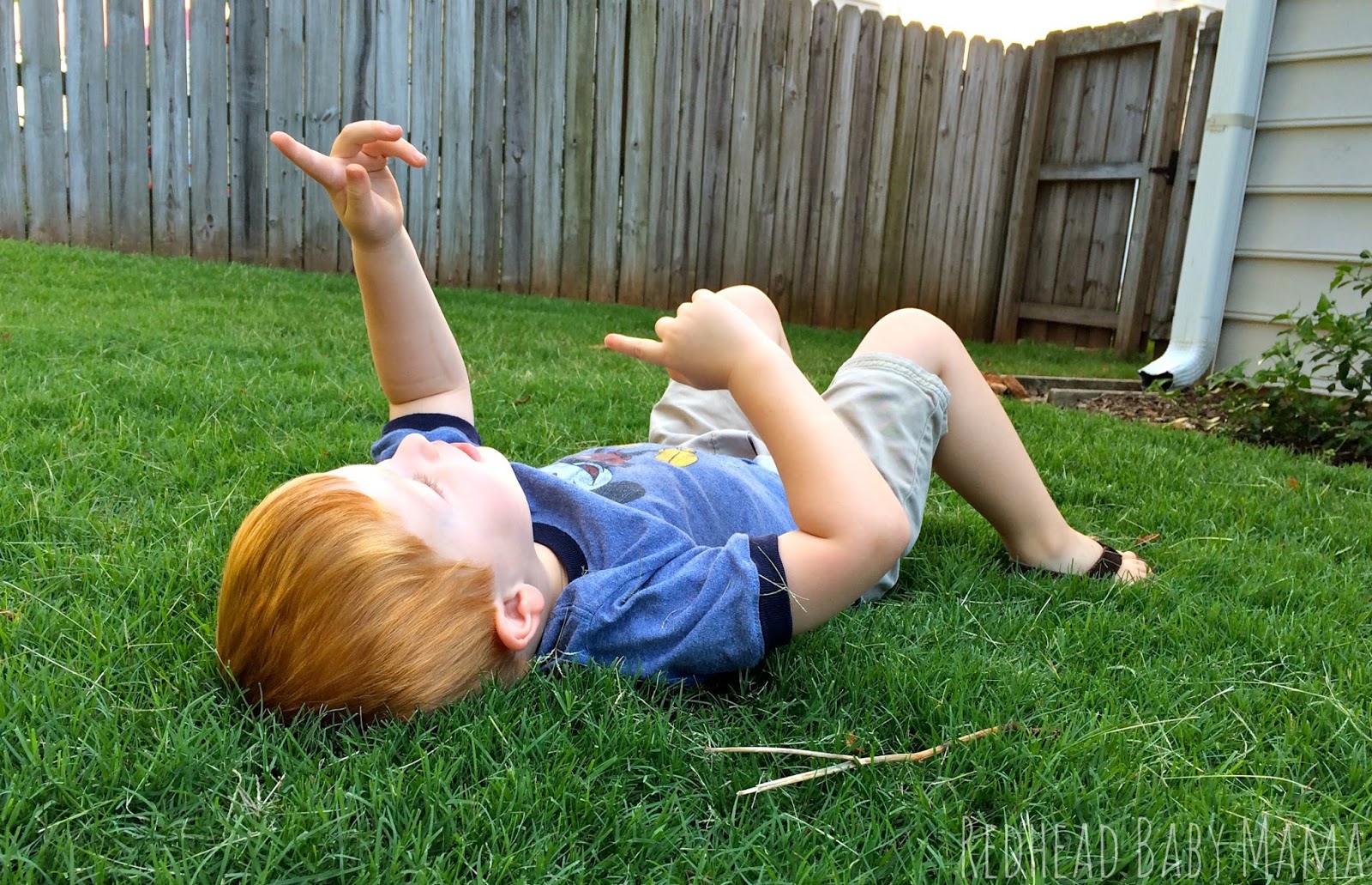 Sometimes, after running around in the yard like a monkey, you need to crash on the grass. I took this opportunity to show Red how to cloud-watch, and I smiled when he marveled at the shapes and colors. Watching him find one of the pleasures of life, as he took a new view on the world, was the high point of my day…
