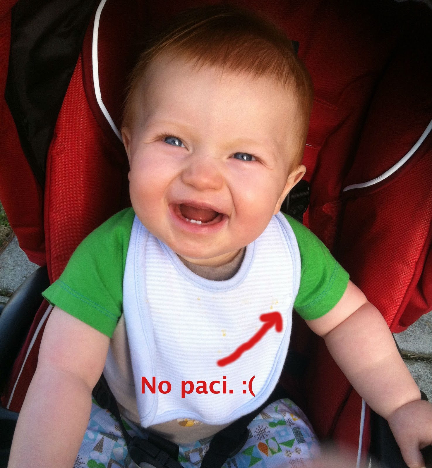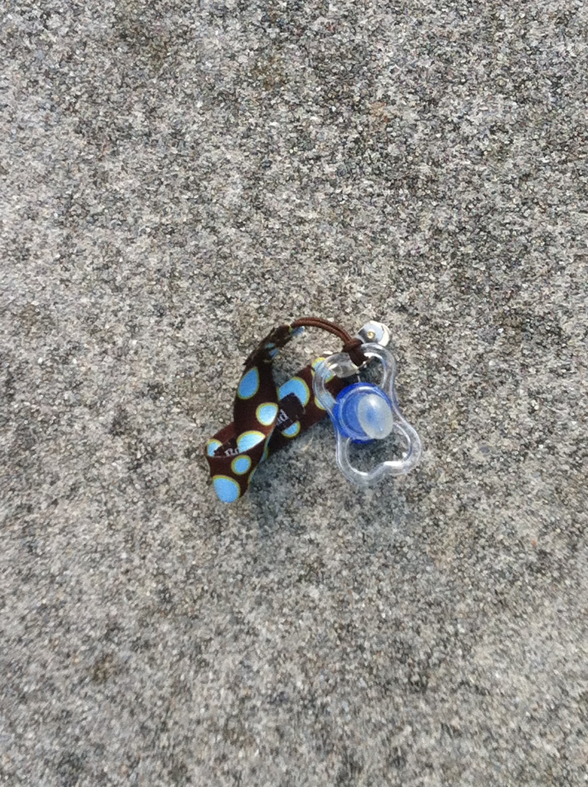We got all the way down, and all the way back to the front of the neighborhood. YES! Red started to fuss a little bit. All that exertion had worn him out, and he needed his paci again. My face fell. Where was the paci? And the entire Paci Grip?!