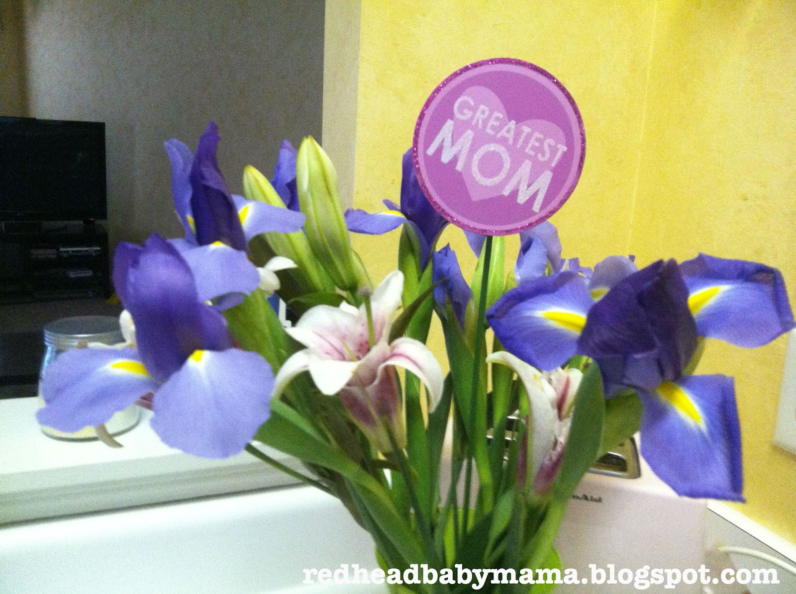 I woke up to blueberry muffins and chocolate milk ready to go – at NINE am in the morning. That’s 90 minutes later than usual, folks, and I loved every bit of it. I got wonderful flowers from Red and Hubs: