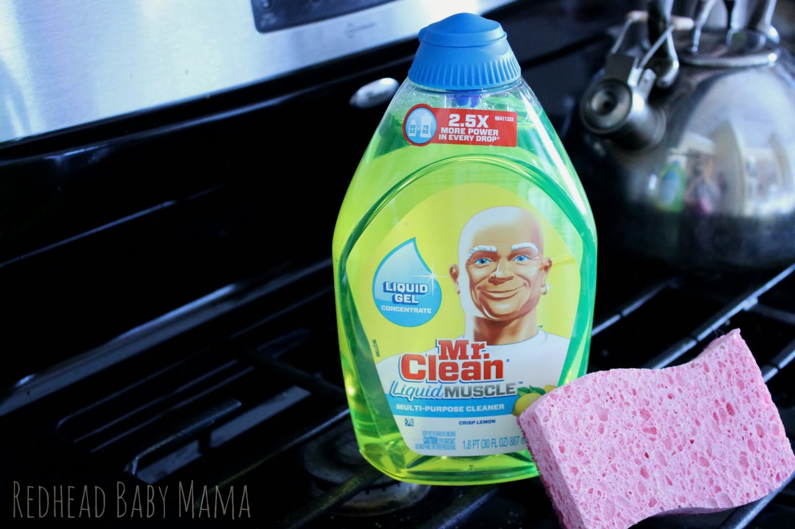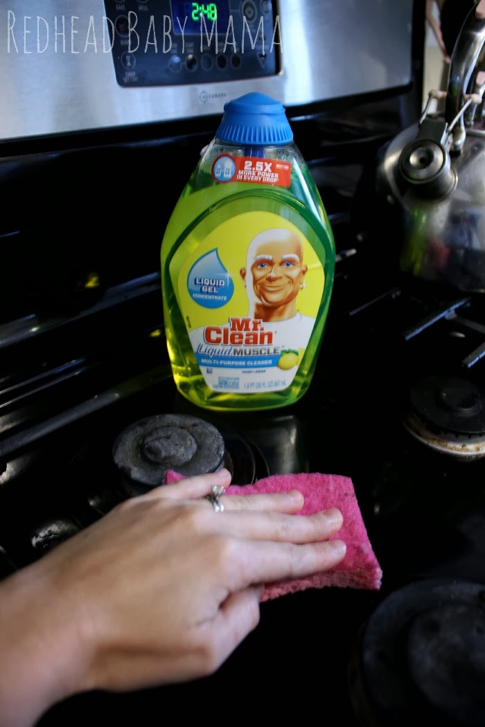 Some of my cleaning resolutions include keeping the stove top CLEAN all year long. I am terrible about leaving a little noodle water sitting around, or perhaps letting the pizza crust crumbs lie there just a little longer… This inevitably makes cleaning up harder and the stove uglier. The new Mr. Clean Liquid Muscle gave a beating to my dried on messes and gave the whole kitchen a super fresh and clean smell of crisp lemons.
