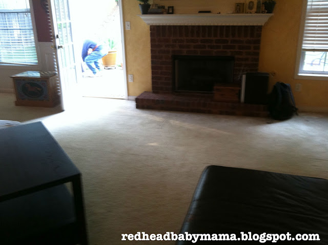 Hubs and I were so excited when we got our first house 3 years ago. Finally a yard, storage, our own space to customize and create. Well, when the former homeowners moved out, the true state of the carpets was revealed. After her furniture was moved, BLACK lines marked every piece. Along the walls behind her cabinets was also BLACK. Not for me.