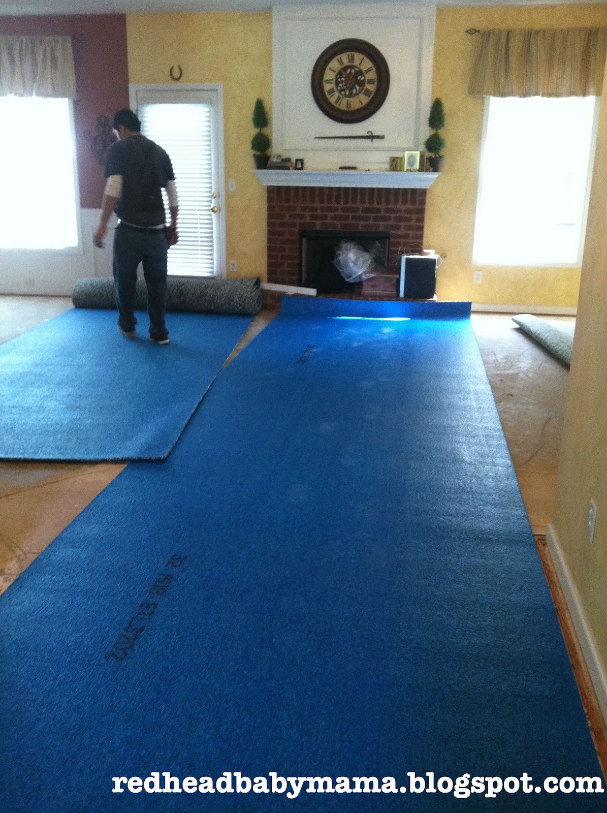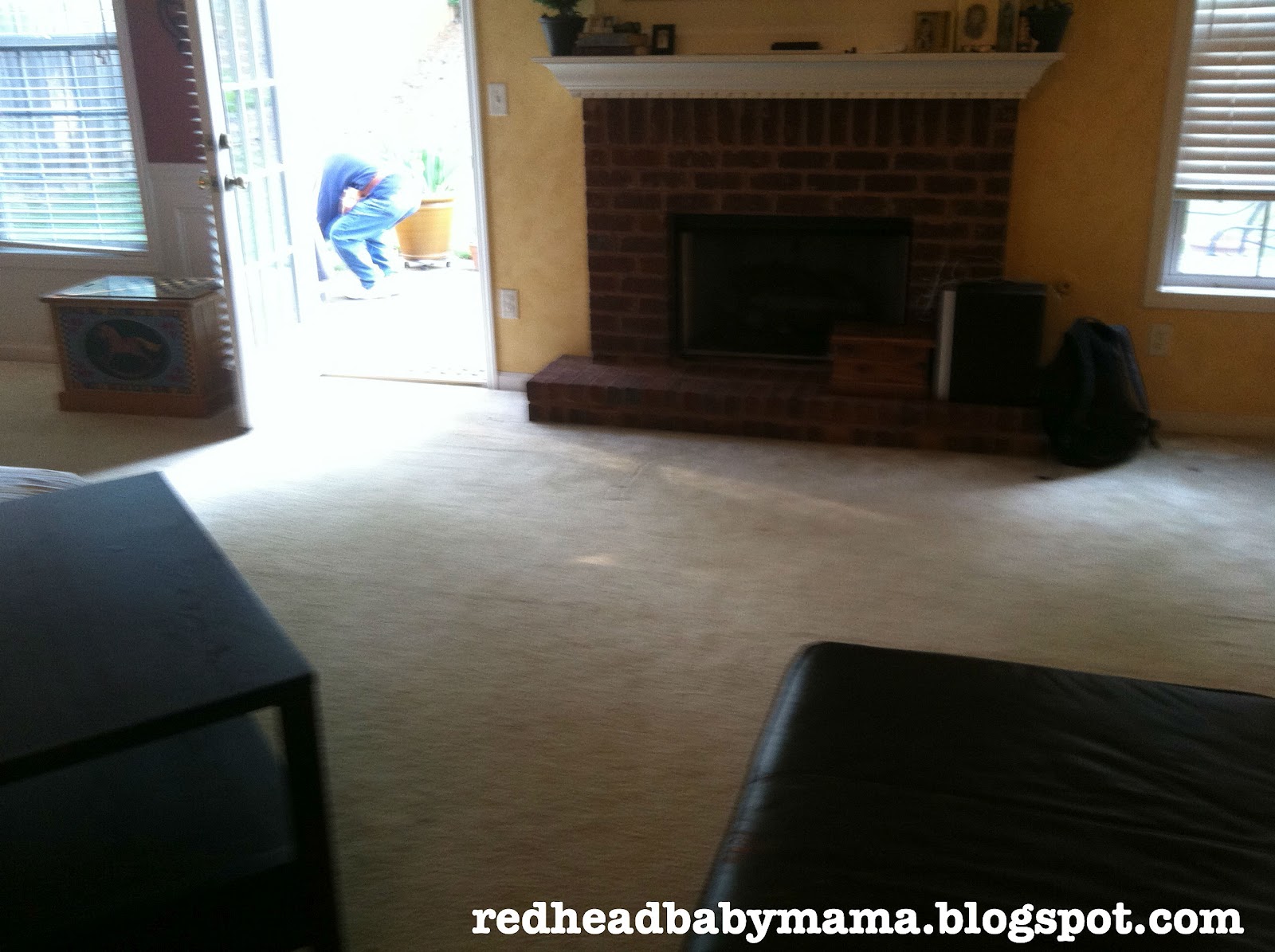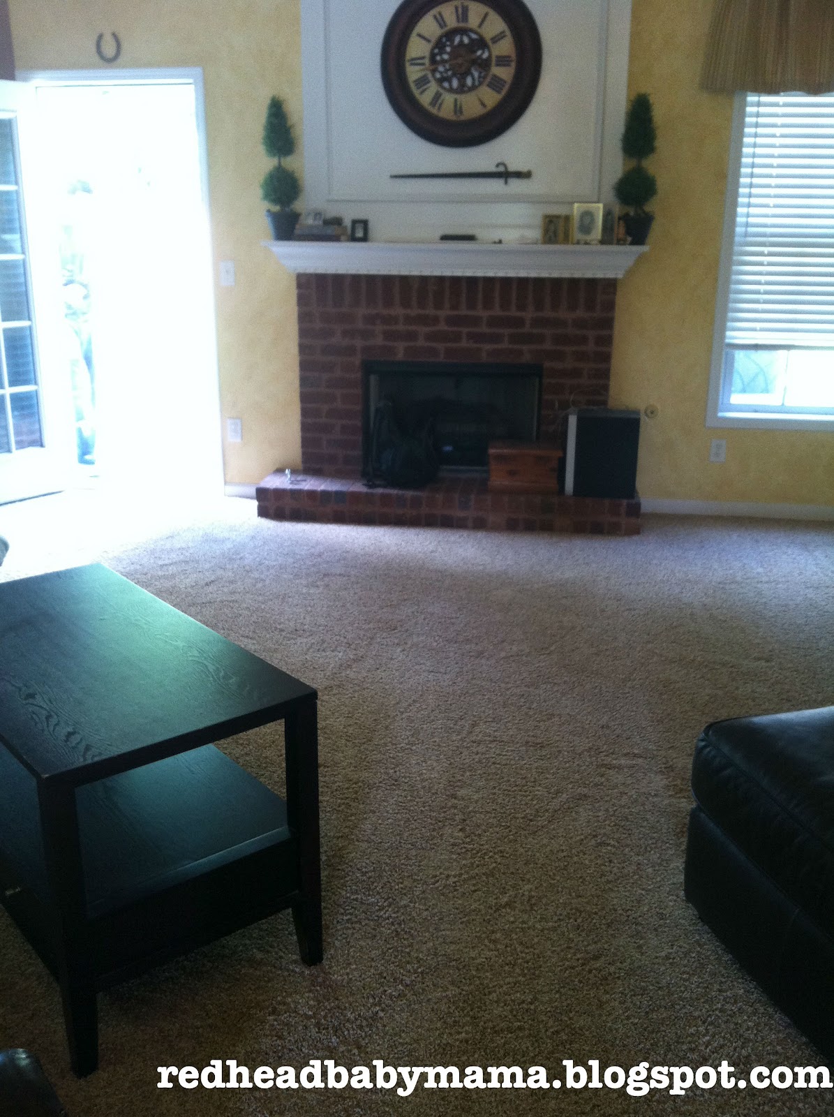 Hubs and I were so excited when we got our first house 3 years ago. Finally a yard, storage, our own space to customize and create. Well, when the former homeowners moved out, the true state of the carpets was revealed. After her furniture was moved, BLACK lines marked every piece. Along the walls behind her cabinets was also BLACK. Not for me.
