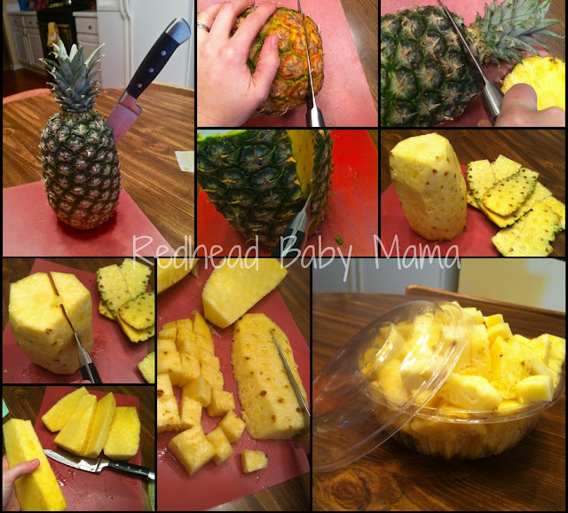 To trick him (Hubs, I hope you’re not reading this!), I bought several whole fruits and chopped them up myself, placing them in a fruit-department-like bowl. I’ve heard many people claim that a pineapple is too hard to chop. Nonsense! Simply cut the tops and bottom off, trim the sides down, cut the four sides off the core, and chop to your preferred size. It couldn’t be easier!
