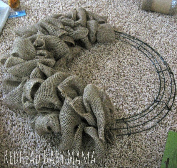 You’ll end up with something like this. As for which spaces to loop, use your judgement. Loop from outside to in, and then inside to out to save on burlap. Squish the loops together at your discretion to create a fuller or looser wreath. (My toenails are still painted in this photo. Score: Mama – 1. Toy background disaster – 2. )