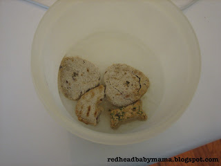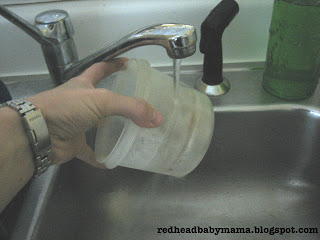 After the second and third layers have frozen well, remove the tupperware from the fridge to present to your pooch. Run under a small stream of hot water until you hear the ice “click”. This means it has released from the tupperware and will slide out into your hands.