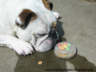 Pooch will then gobble up said cereal and start licking his ice treat. Once they start licking and the weather is warm, the ice treat will melt and your frozen veggies and treats will come to the surface!