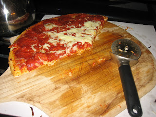 I let a slice cool, and dice it up with the pizza cutter. I’ve found that Red can’t quite get to the thin crusty under layer, so I’ll peel it off for the time being. The pepperoni, cheese, sauce and bread base get devoured.