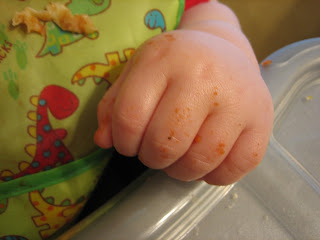 Now, the process of eating can be a messy one. These little hands get covered in food for every meal as he learns to feed himself, but nothing causes a bigger mess than pizza! (Spaghetti is yet to come!)