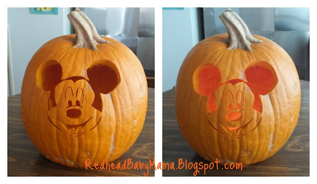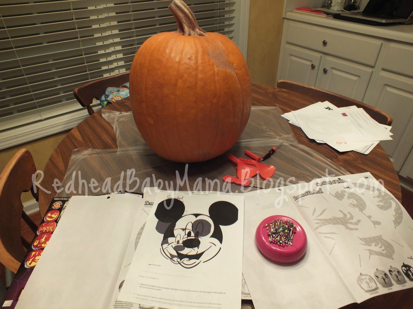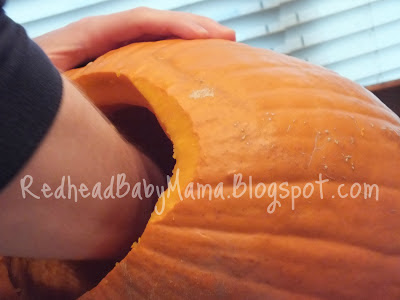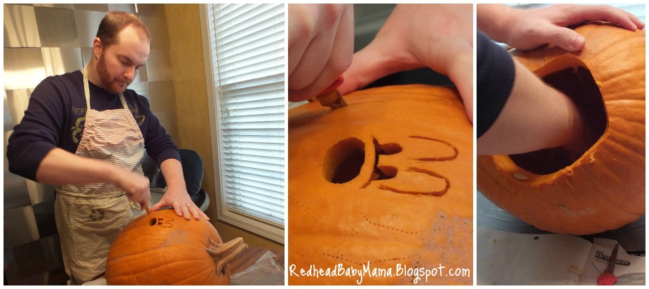 Here at the Redhead House, we like to cut off the bottom of the pumpkin. No lids to fall off, and it’s more aesthetically pleasing. Not to mention it makes leveling a rocking pumpkin EASY! Cut your hole as large as you want it, and then if your pumpkin still rolls around, shave off the edges to make it level.