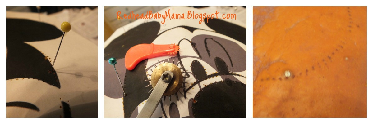 Some pumpkin carving “kits” (we got ours at Target for $4) come with little tracing wheels. These are so awful it’s scary. I am a costume designer, so I have a real pounce wheel that will poke you if you look at is sideways, so we always use that (in center photo).
