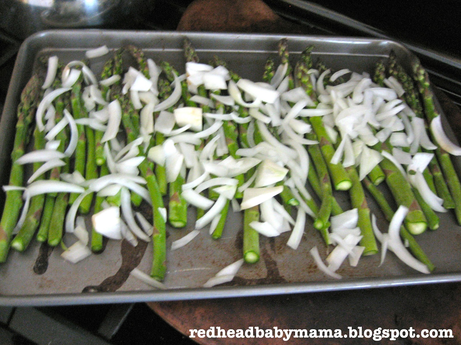 Then lay your stalks all the same way, trying not to stack them at all. I like to use my jelly roll pan for this, ungreased. Chop up your onion into slivers, squares, or bite sized pieces. Sprinkle your onions evenly on your veggie layer (if you have an onion allergy, the recipe is delicious without them, too!)