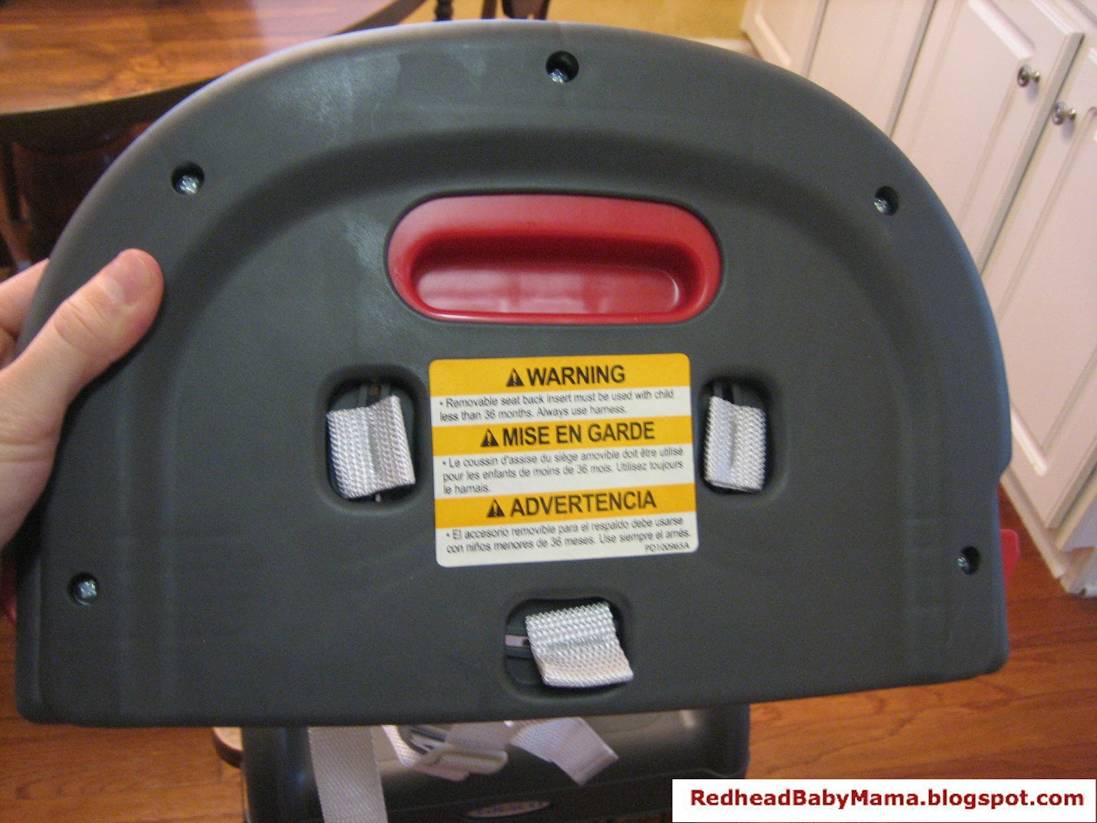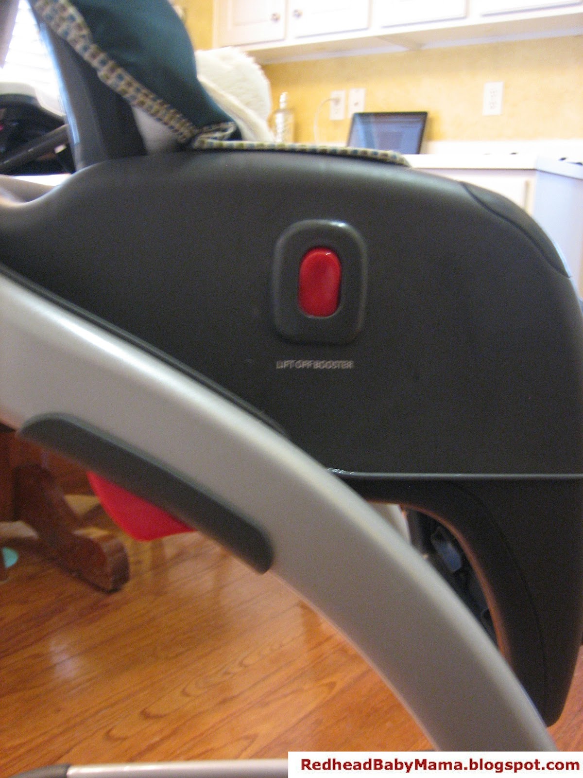 The booster seat itself has yet another function. The side of the high chair has two little red buttons (again with the red) that can be pushed, which lift off the high chair set so it can be set on the (back removed) booster seat. Oh yeah. A portable high chair that you can take with you. Or you can take the booster – it’s up to you!
