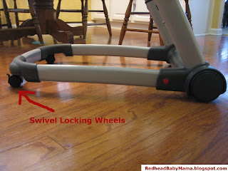 has 2 sets of wheels – a fixed set for the front, and a swiveling, lockable set on the back. This allows for maneuverability in the kitchen, and ease of movement when I need to whisk Red and his chair into the bathroom so I can try to grab that quick shower before he screams bloody murder.