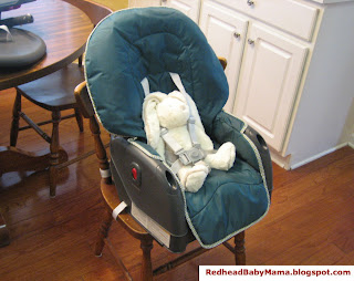The booster seat attaches to a chair in your home the way most others do. An adjustable strap around the back, and one around the base of the chair, making it very sturdy. It also has a seat belt with crotch strap (3 point) for wiggly little babies. The back of the booster seat is removable for older toddlers, and adjustable for smaller ones (see the 2 slots on the inside side of the seat?). A red lever on the back (red levers everywhere on this thing!) clicks easily to move it.