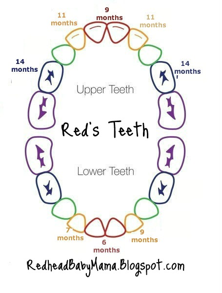 When this is the case, I’ll administer a little Infant Advil or dye-free Tylenol to help with the pain. If you find that you are dosing your baby often, some pediatricians recommend alternating medications. Lastly, here is a chart to help understand when your baby’s teeth will come in. Front teeth come first, followed by front-side teeth, molars, canines, etc. But every baby is different. Red got 3 front teeth first, rather unconventionally, and then 3 more showed up at once. Each baby is different.