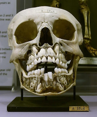 It can take several months for a tooth bud to form, descend, swell, poke through the gums and continue to it’s rightful place. In a child, baby teeth are lost and adult teeth emerge in a pattern similar to this photo below. A child’s skull, studied by science, to see how teeth are already mature and wait to emerge from the child’s gums. (I’m a science nerd, so these photographs don’t bother me – my apologies if I make you squirm!)