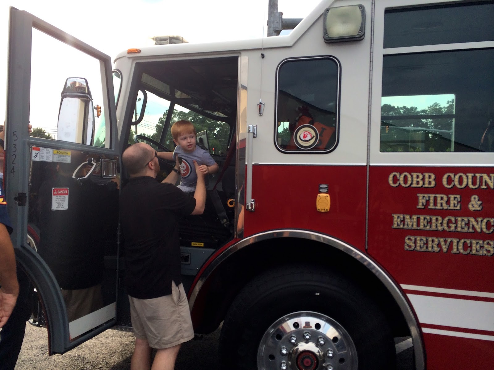 Right on the heels of Cow Appreciation Day, I drug our family back out to Chick-fil-A for something our branch calls Family Night. Fun, family friendly activities or themes are held every Thursday for a few hours over the summer. This past week, it was Safety Night with our local county heroes of Fire and Police. We had a quick meal with coupons I had saved up, some Red-requested slide time on the playground, and then the big fun arrived. The Chick-fil-A cow came out to greet Red, and immediately afterwards, the big rig firetruck pulled into the parking lot.
