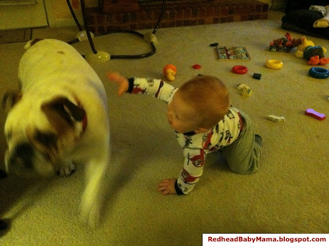 I managed to get Dooley to answer a few questions about how he feels about the whole thing. But then Red decided that he wanted to pet Dooley again and went right after him, causing the English Bulldog to dodge the baby by escaping around the ottoman. Swiftly.