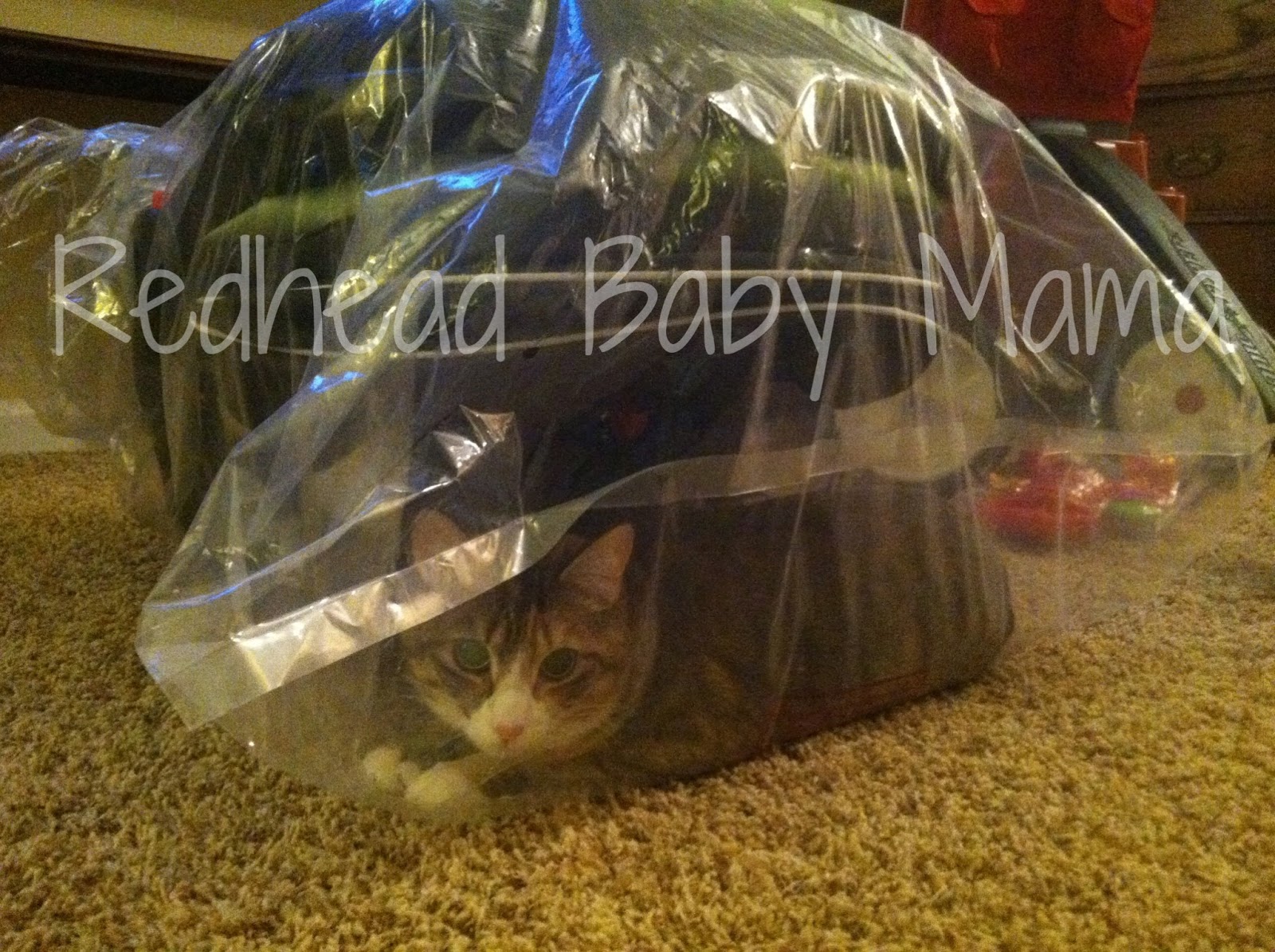 A fabulous car seat came with our new stroller last week, and it was still in the bag a few days later, loosely tied at the ends. Somehow, Kitty found an entrance and was quite happy in her bubble.