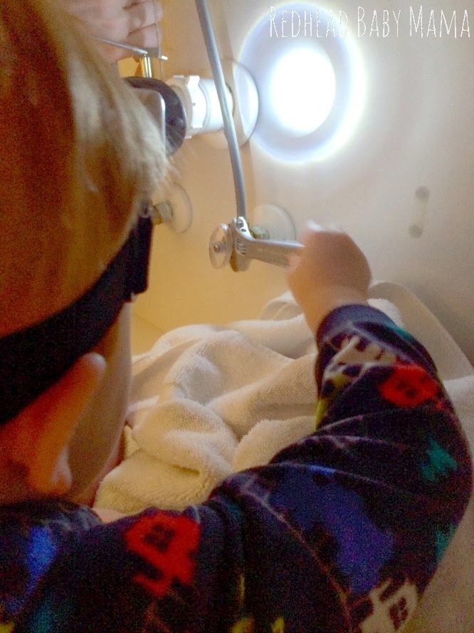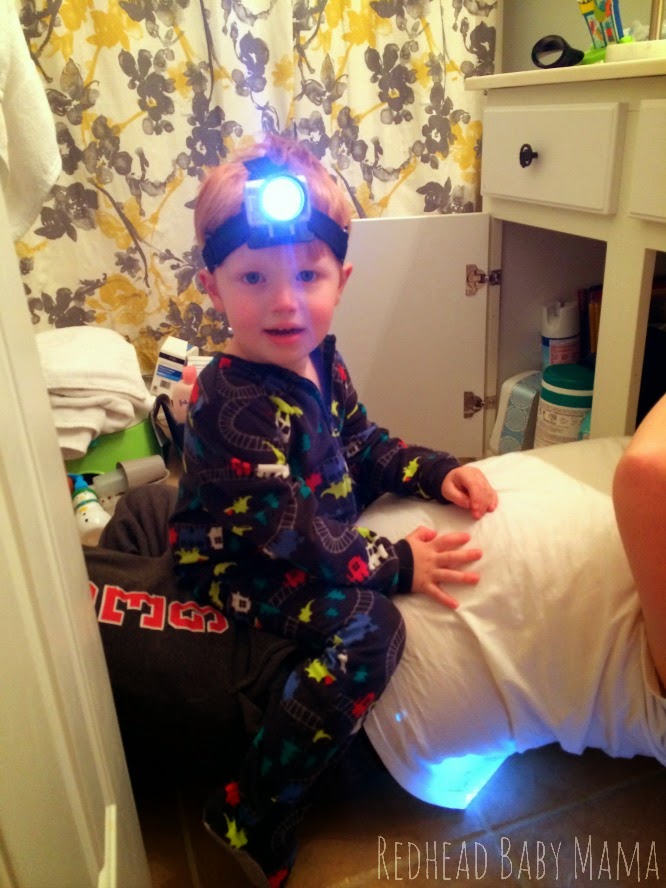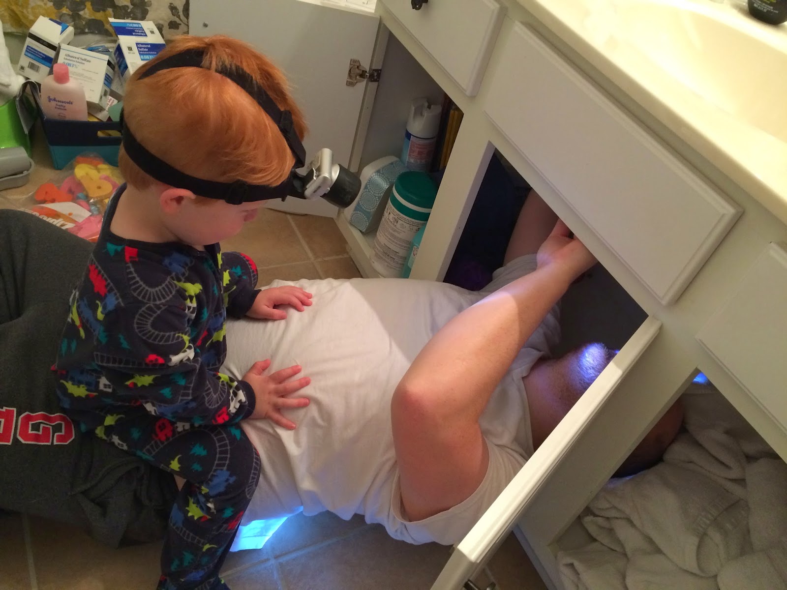 Daddy was working diligently on replacing the broken faucet in the guest bathroom this week. Red wanted to be with him so badly, he crawled over ALL the sink innards, strapped on the headlamp (even though Daddy could have used it) and went to work “helping” and copying…