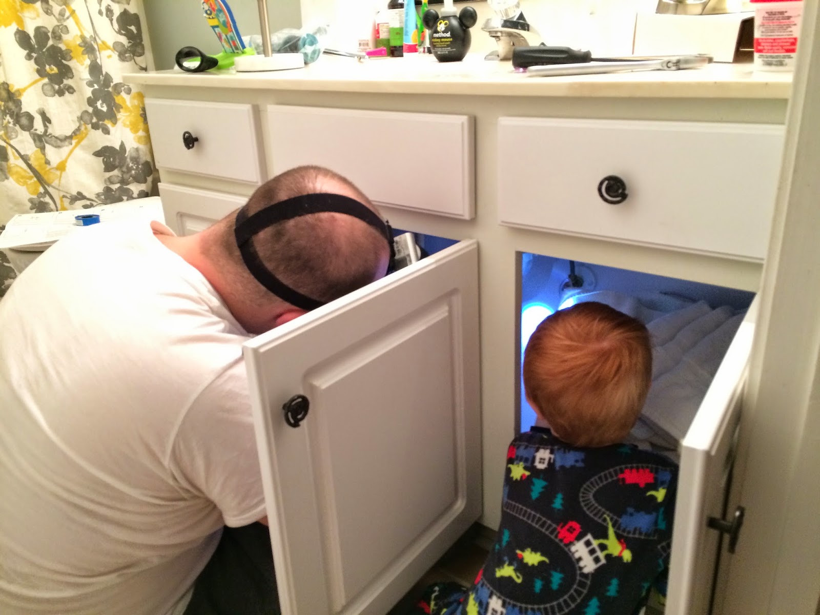 Daddy was working diligently on replacing the broken faucet in the guest bathroom this week. Red wanted to be with him so badly, he crawled over ALL the sink innards, strapped on the headlamp (even though Daddy could have used it) and went to work “helping” and copying…