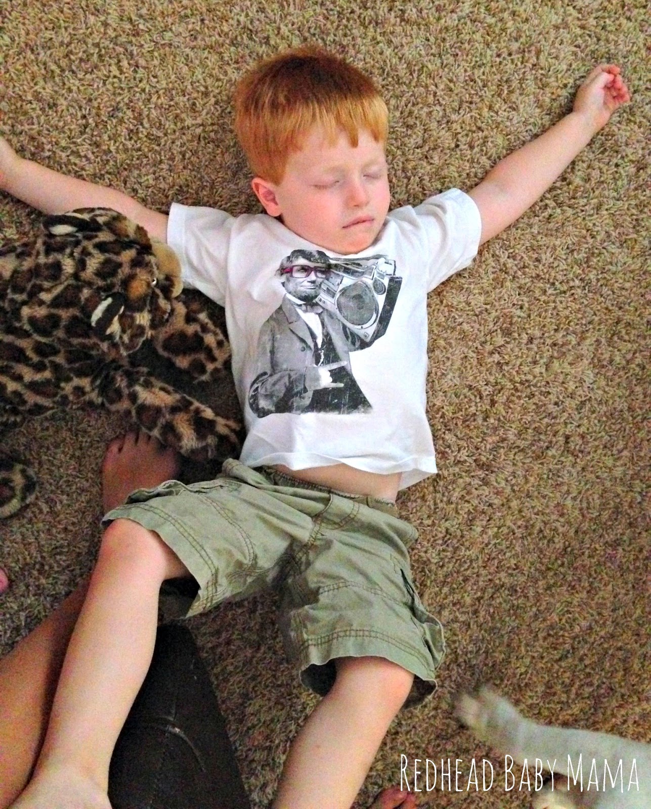 Tuesday, while I was out working on a film project, Hubs was at home with Red and a fabulous Mother’s Helper. Hubs came down from work to start dinner, and Red fell asleep instantly on the floor. He was so tired that he nearly fell onto the floor to sleep. Has your kid ever passed out mid-play? (Photo credit on these totally goes to Hubs!!)